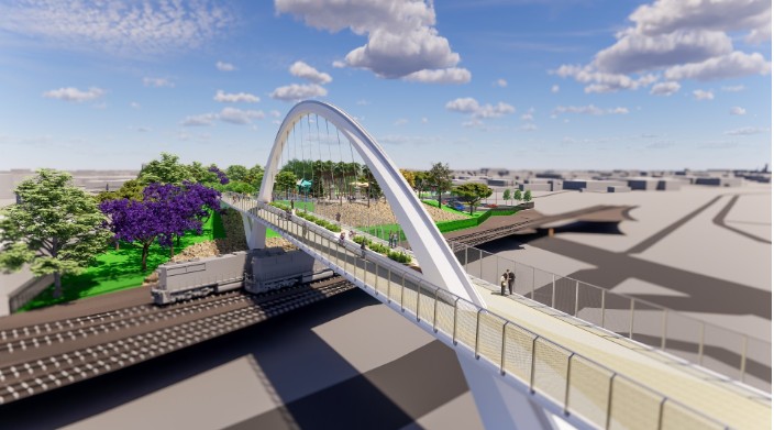 El emblemático puente peatonal del proyecto está planificado como una estructura de arco atirantado de hormigón que ofrecerá un cruce seguro sobre las vías ferroviarias en funcionamiento y se conectará con el Paseo Marítimo de Wilmington, un proyecto del Plan de Inversión en el Acceso Público del Puerto (PAIP) que finalizará a principios de 2024.