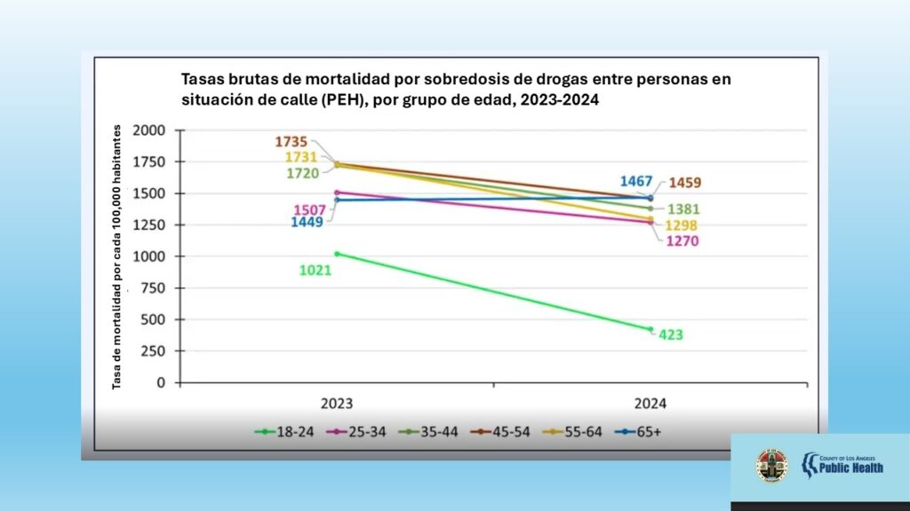 Las muertes por sobredosis de drogas continúan disminuyendo drásticamente en el condado de Los Ángeles y en todo Estados Unidos gracias a la ampliación de las inversiones en prevención, reducción de daños, tratamiento y recuperación. Sin embargo, las tasas de mortalidad por sobredosis siguen siendo desproporcionadamente más altas en las comunidades negras, latinas, indígenas y de bajos ingresos.