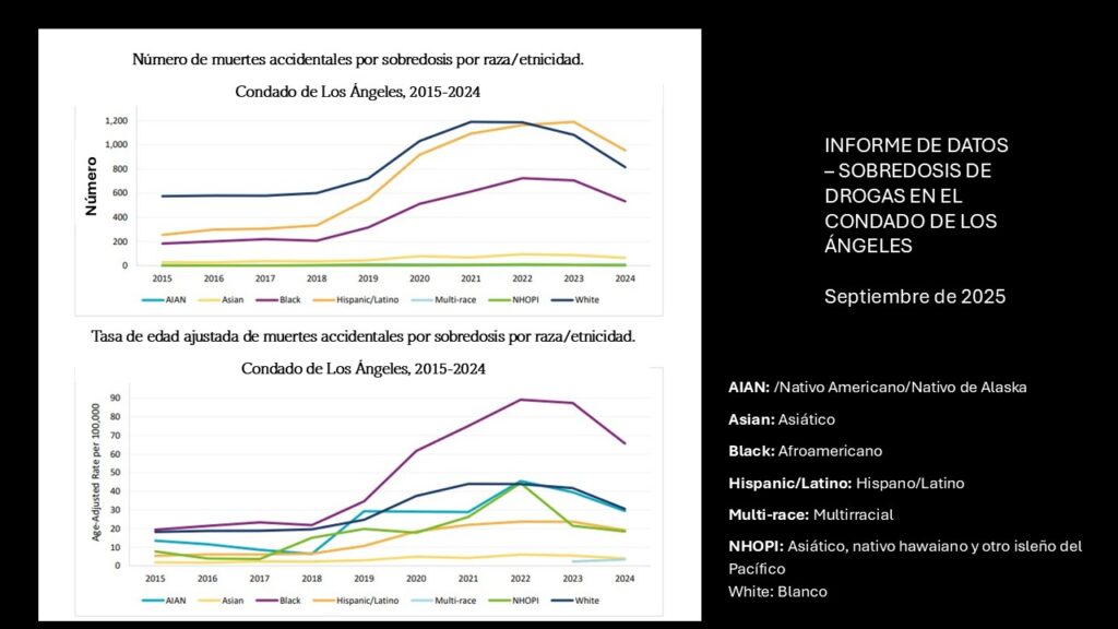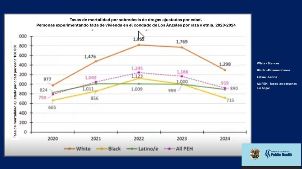 “Si observamos los datos demográficos raciales de las sobredosis —y esto se refiere específicamente a las sobredosis relacionadas con el fentanilo—, los residentes afroamericanos del condado de Los Ángeles continúan presentando la tasa más alta de sobredosis en comparación con los residentes blancos, latinos y asiáticos del condado”, precisó Brian Hurley, psiquiatra especializado en adicciones del Departamento de Salud Pública durante una conferencia de American Community Media (ACoM). “Las disparidades raciales persisten”.